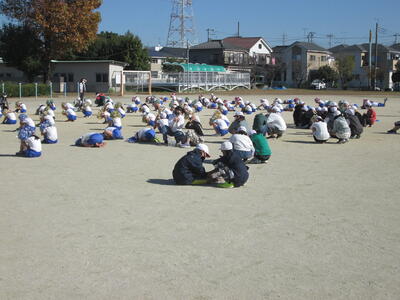 本校でも緊急地震速報に対応する訓練を行いました。1・2年生は運動会の練習を、6年生は理科の野外観察を行っていましたが、みんな静かに校庭の中央に集まり、身を守る姿勢をとっていました。
