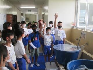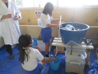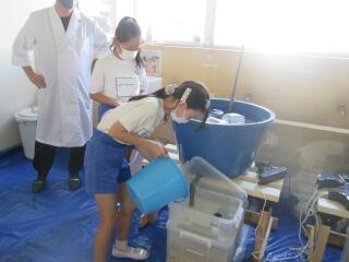 掃除の仕方や海水の作り方を教わり、いよいよヒラメを受け入れました。