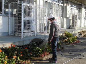 *園芸委員の子どもは、毎朝花壇の花に水を与えます。