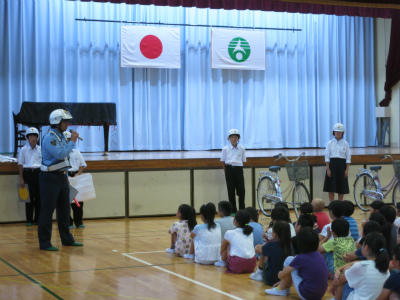交通安全では、ヘルメットの着用、交差点での横断の仕方、一時停止について中学生が手本を見せながら話していただきました。また、非行防止については、子どもたちだけでの学区外に行かないこと、花火やBB弾などの危ない遊びをしないことについて確認しました。さらに、水遊びの危険についてもご指導いただきました。身近な先輩やいつもお世話になっている警察官や交通指導員さんからのお話ということもあり、子どもたちはより真剣に聴いていました。夏休みは安全な日々を過ごしてくれることと思います。