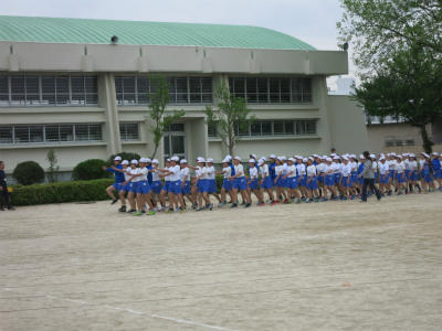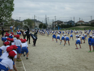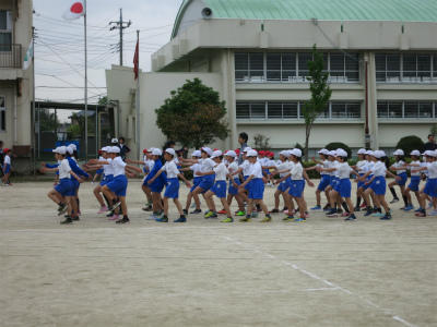 今日の業前運動「さわやかタイム」に、初めて1年生が参加しました。お兄さんお姉さんの運動をよく見て、同じように運動しました。退場行進も手を振って元気に行進できました。