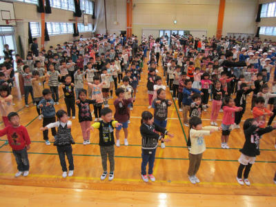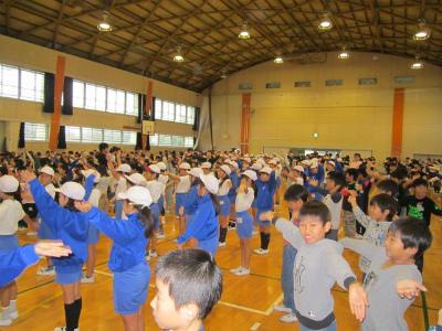今朝は雨のため、さわやかタイムを体育館で行いました。簡単な運動で、体をほぐします。