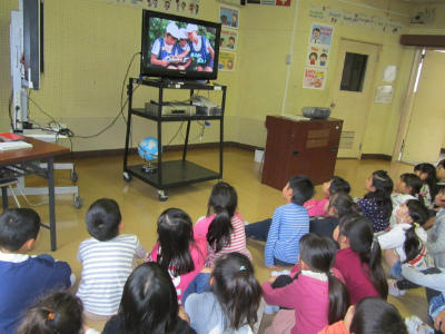 鉄棒の「さかあがり教室」です。まずは、逆上がりのポイントをビデオで見ます。