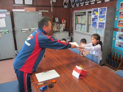 2年生が校長室で、かけ算テストの校長テストを受けています。みんな緊張しています。