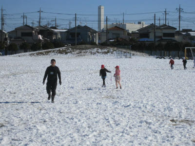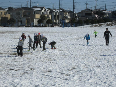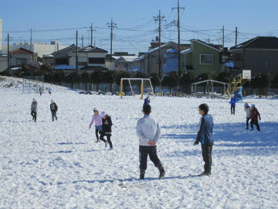 業間休み、雪で遊ぶ子供たちとそれを見守る教師。でも・・・、寒いせいか、遊ぶ子が少ないです。