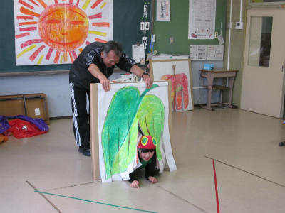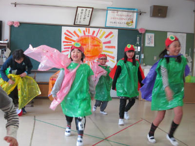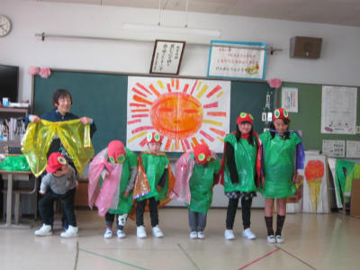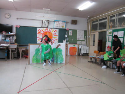 先日の授業参観で発表した劇を校内で発表してくれました。
