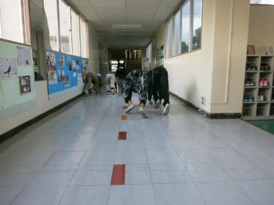 朝ボランティアの廊下の雑巾がけを6年生が5年生に引き継いでいます。