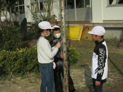 国旗・市旗・校旗の掲揚。6年生に教えてもらった5年生が、毎日準備しています。落ちないように結びも確認しています。それぞれの活動が、しっかりと下級生に引き継いでいかれます。それが豊野小の伝統となります。