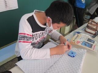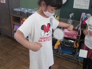 厚紙を切って、ひもを通してブンブンごまを作りました。