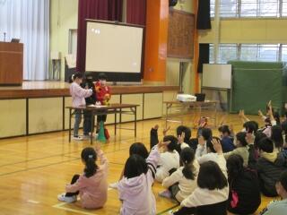 運動委員会の児童が、体をきたえる・安全・給食の3つの視点から