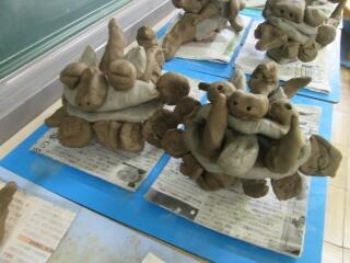 焼き物粘土を丸めたり、平らにしたりしながらシーサーを作りました。