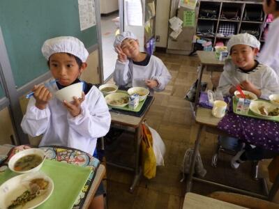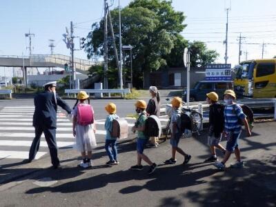 毎朝、交通指導員さんと保護者の方に見守られています。