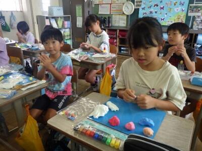 白い紙粘土に絵の具を混ぜることにより、カラーのねんどになります。