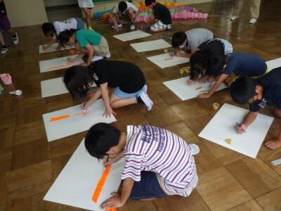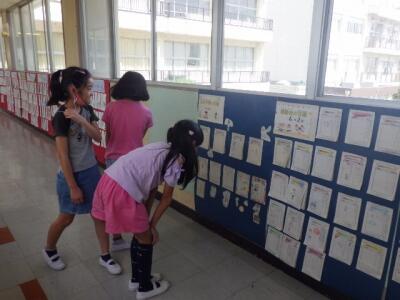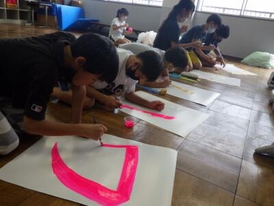 児童会室では、代表委員が運動会のときに掲示するスローガンを書いていました。