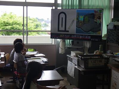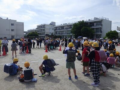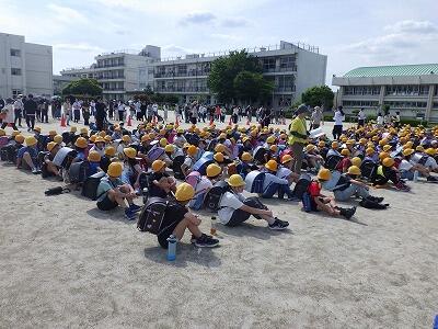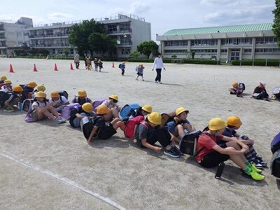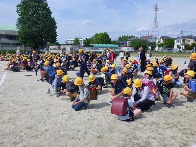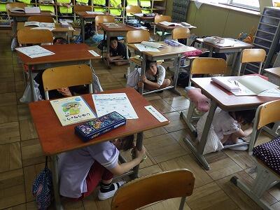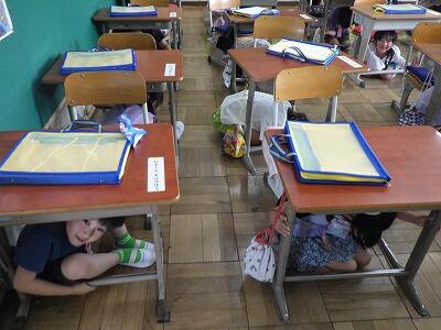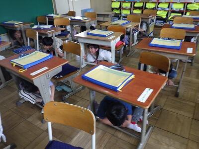 4月に一度訓練をしているので、素早く机の下に身を隠しています。
