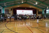 今日の音楽朝会は、明日開催される『鼓笛・金管バンド中央大会』に出場する金管・バトンダンスクラブの壮行会を行いました。