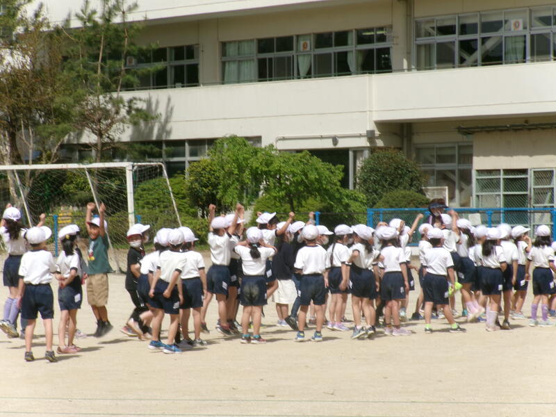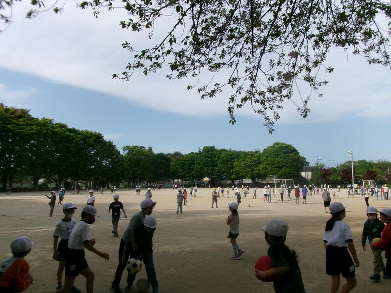 ふと校庭を見ると、2年生と学年の先生方が、みんなでボール回しゲームをしていました。ボール回しはお友達に受け取りやすく回したり、声をかけたりと、相手への思いやりが必要なゲームです。まだまだ新しいお友達や先生に慣れていない子どもたち、今日の活動でぐっと距離が近づいたことでしょうね。