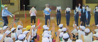 暑さが厳しく、学年全体実施と変更になった講習会。交通課の方々に工夫していただき、短い時間で充実した内容に変更していただきました。4年生のみんなが驚いたのが、「歩道を走っている自転車は、歩行者に注意を促すためにベルを鳴らしてはいけない」ということ。正しくは、【①自転車は、まず自転車から降り、自転車を押す。②歩行者の横を通る時は「自転車が通ります。」と歩行者に声をかける。】ことです。大人もルールに従って行動するべきですね。もうすぐ夏休み。安全に過ごすために必要な学びでした。