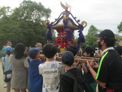 子どもたちの元気いっぱい「わっしょい!!!」の掛け声に合わせて、子ども御輿パレードが始まり、縁日やスポーツイベントがある深町公園へ。暑さに負けず、最後までかつぎ切りました。地域とのつながりの中で成長し続ける子どもたち。未来の内牧夏祭りを担うのは、君たちです! 期待していますよ♪