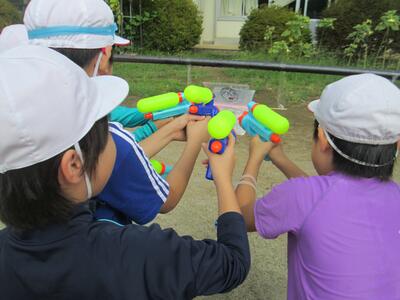 準備も上々です。みんなで力を合わせて、水鉄砲で的をねらいます♪