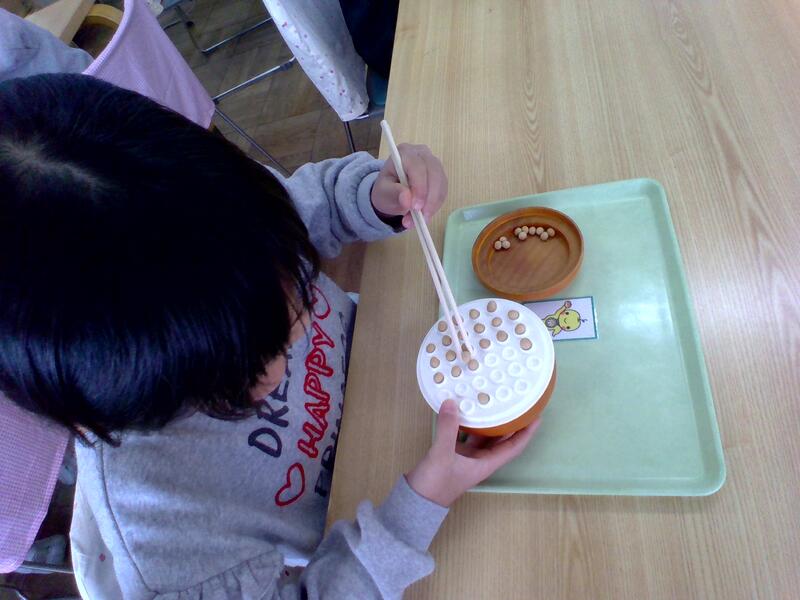 まず、普段のはしの持ち方をしてから、正しいはしの持ち方について学びました。合わせて、食事の時の正しい姿勢についても学びました。正しい姿勢で正しいはしの持ち方をして、製氷皿にスポンジをひとつひとつ移して、はしを使う練習をしました。食育教室を通して、はしの持ち方がきれいになり、はしの扱いも上手になりました。これからは、食事でたくさんはしを使って、おはし名人を目指して欲しいと思います。