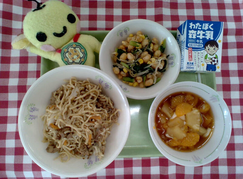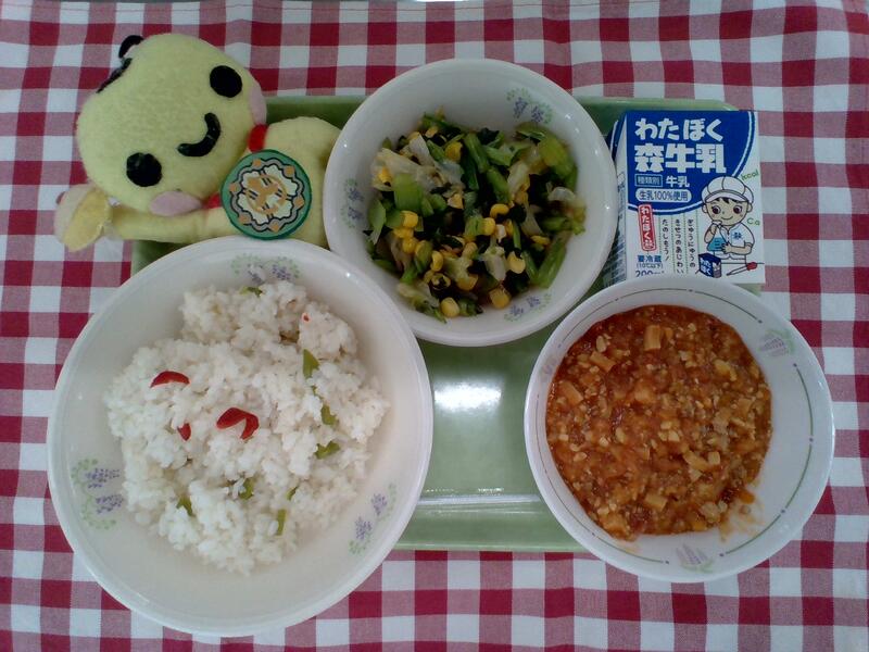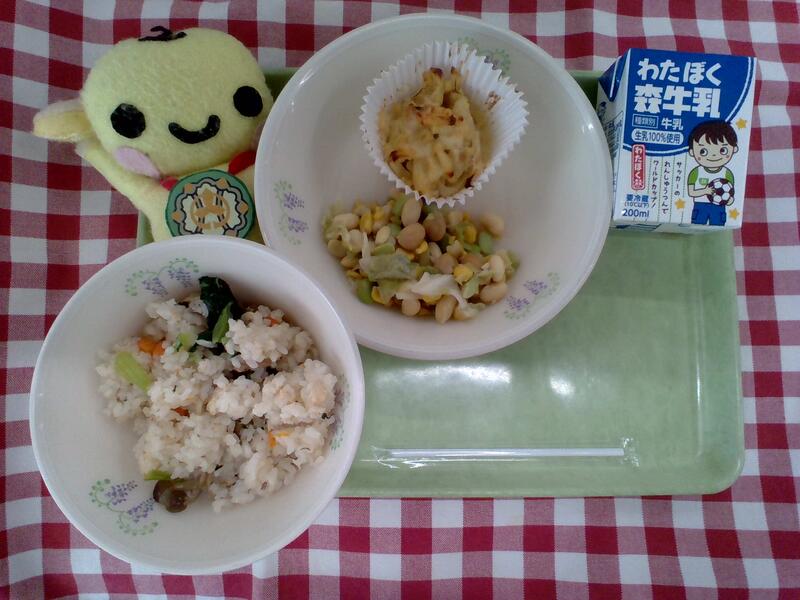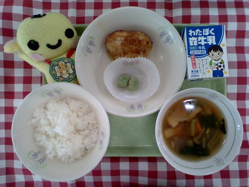 ★1年生の児童がさやむきをしたそら豆を給食室で塩ゆでにして、全校でいただきました。
