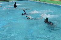 初めはプールサイドに座って水を浴びます 後ろを向いてプールに入ります
