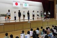 内牧小学校にある10の委員会の委員長がステージに立ち、自分たちの活動内容や委員会からのお願いを発表しました。どの委員長も、しっかりと前を向いて、はっきりと発表することができました。また、それぞれの委員会の活動に合った小道具も用意し、興味を持ってもらえるような工夫もしていました。