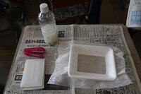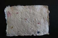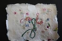 ペットボトルにちぎった牛乳パックと水とビー玉を入れ、よく振りながら細かくしました。それを使って、トレイで作った器具で和紙を漉きました。色々な材料を組み合わせて作りました。ベランダで乾かして完成です。