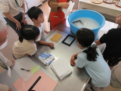 お話しいただき、自分たちで紙をすいてはがきにしていきました。
