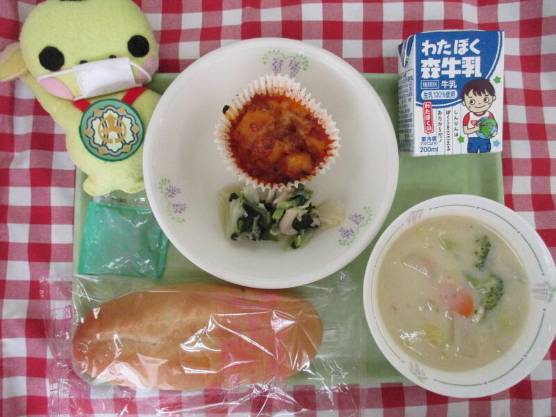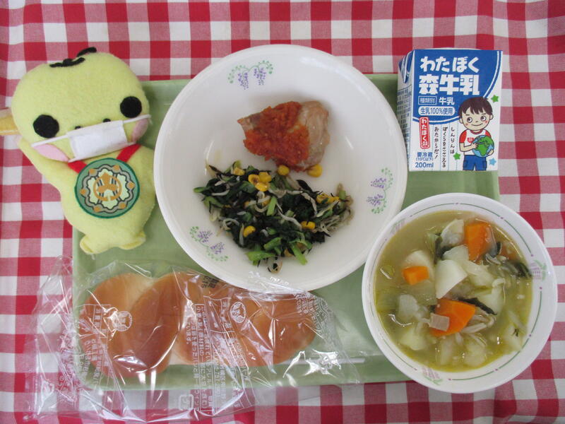 感染予防対策のため、今週1週間は簡易給食を実施します。内容は「主食+牛乳+おかず2品」とします。