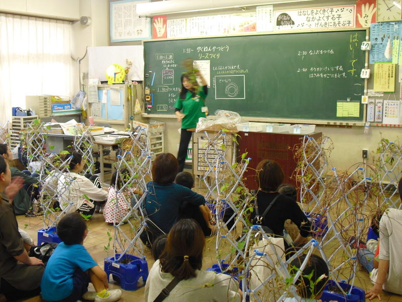 5月に種まきしましたアサガオが、たくさん花を咲かせ、種とりまで終わり、枯れたツルでリース作りを親子で行いました。世界でたった一つのオリジナルなリースを作ることができました。