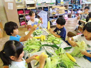 3年生がトウモロコシの皮むきを行いました。剥いたトウモロコシは給食の時間に各学年へ配られました。