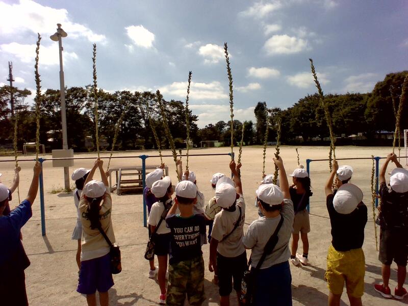 2年生が金ごまの収穫をしました。しっかりした丈夫な茎を担任が刈り取り、みんなで生活科室に運んでいきました。自分の背丈よりも大きく育った金ごまの茎を、ひとりひとりが大切に運んでいました。ブルーシートの上で1ヵ月程、乾燥させて、ごまの実を集める作業をします。出来上がりが楽しみですね!