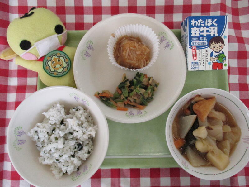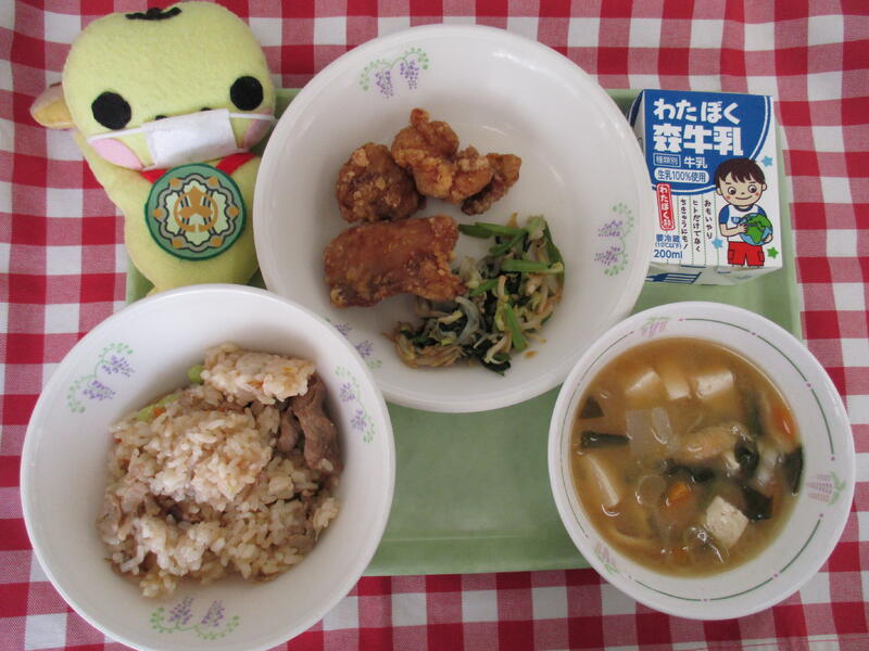分散登校中は、全児童が同じメニューを食べられるように、2日間同じ献立を提供しています。