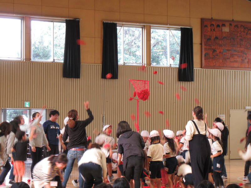 クラス対抗玉入れ合戦。1回戦は子ども同士。2回戦は保護者の方々も子どもにまじって一緒に玉入れを楽しむことができました。どの勝負も白熱した試合が繰り広げられました。