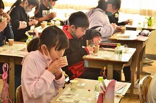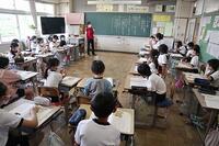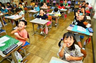 青少年育成の会の4名の会員の方と、コロナ禍の内牧小の子ども達の様子
