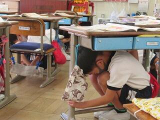 春日部市の昨日の緊急地震速報の訓練に合わせて、学校でも机の下にもぐって