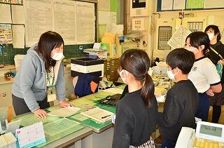 前回は、クラスごとに学校を巡り、どんなところがあるのかを学びました。今日は、自分が興味・関心のある場場所について、グループごとに見学に行き、担当の教師に質問をすることを学びました。