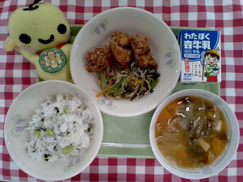 ★7月18日は、内牧小学校の開校記念日です。少し早いですが、開校記念日をお祝いして、人気メニューの鶏肉の唐揚げをいただきます。