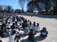 防災無線から流れる緊急地震速報を受け、まずは安全確保のため机の下に避難しました。その後、校内放送による教頭の指示で、校庭に避難しました。