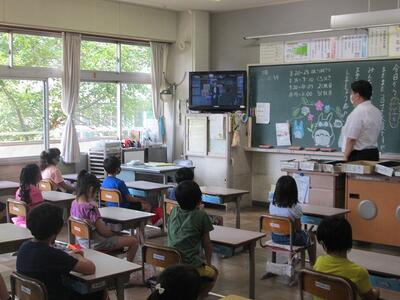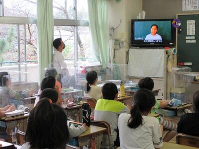始業式の校長講話はテレビ視聴となりました。校長先生の話を聞く児童の真剣な顔を見ると、