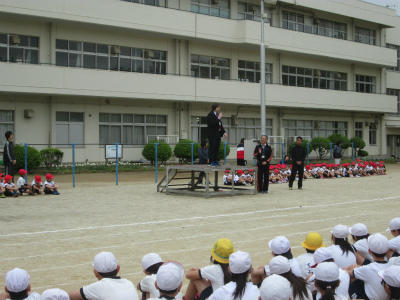 朝礼台の上にのって、入場行進の様子を見ていると、1年生もしっかりと手を振って入場してきました。初めてなのに、とてもかっこいいです。