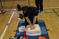 春日部消防署からお借りした、人形とAED練習機を使って、心肺蘇生法について研修を実施しました。