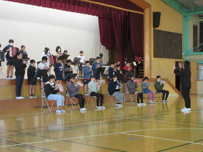 1組は「コンドルは飛んでいく」を合奏しました。木琴や鍵盤ハーモニカの和音の響きにのってリコーダーの旋律が始まり、鍵盤ハーモニカに旋律がうつります。ピアノや木琴の刻んだリズムにのって曲が盛り上がり、最後はリコーダーのソロでしめくくりました。曲想が移り変わっていく様子を表現できました。