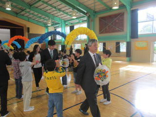 本日は離任式がありました。転退職された先生方が内牧小学校に来てくれました。久々に会って喜んだり、別れ惜しい気持ちがあふれたりしてしまう児童が見られました。児童たちの先生達に対する愛情を感じることができました。