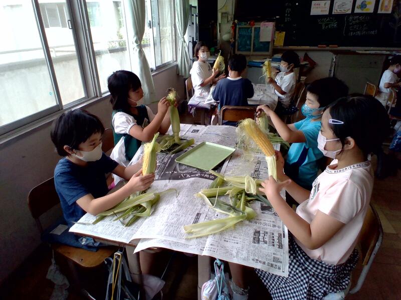 3年生とひまわり学級のみなさんが1時間目に、とうもろこしの皮むきをしました。栄養士からは、とうもろこしの栄養や皮むきの手順についてのお話をしました。とうもろこしのひげの数が粒の数と同じになっていることや食物繊維が含まれていて、お腹の調子を整える働きがあることを学びました。こどもたちはとうもろこしの皮をむき、ひげの部分を丁寧に取り除いていました。