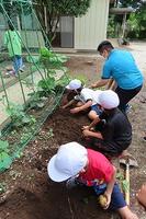 内牧小学校では例年、2年生が元気塾の方々の支援をいただきながら、近隣の畑で金ごまの植え付けをしていました。今年は諸事情により畑で活動ができないため、元気塾の方々のご厚意により、校庭の花壇にゴマを植えることができました。