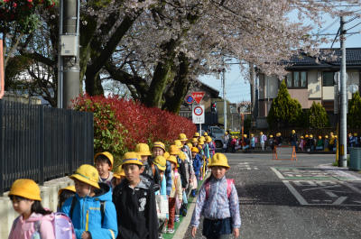 1年生になって、初めての校外での学習です。交通事故に合わないように注意しながら内牧公園まで歩いて行き、アスレチックをしたり、「春」を見つけたりしながら、友達と仲良く活動することが目的です。朝の挨拶の後、みんな元気に出発していきました。内牧公園に着いた頃を