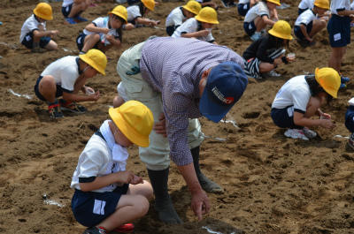 昨日5月16日(火)3・4時間目、 「内牧の食育」の実践で、2年生がゴマの種まきをしました。まちづくり協議会・元気塾の皆さんのご協力で毎年実施しているものです。
